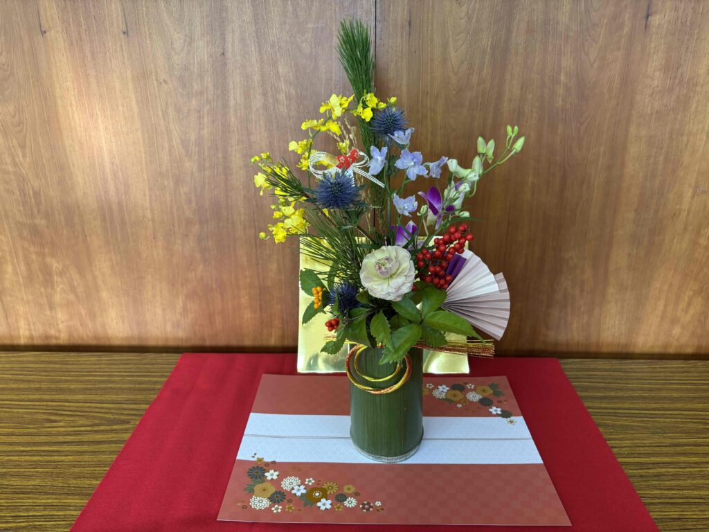 花の器の「タケ」、縁起の良い赤い実のついた「ナンテン」「センリョウ」は大棚杉の森ふれあい公園の植物を利用しました😊
