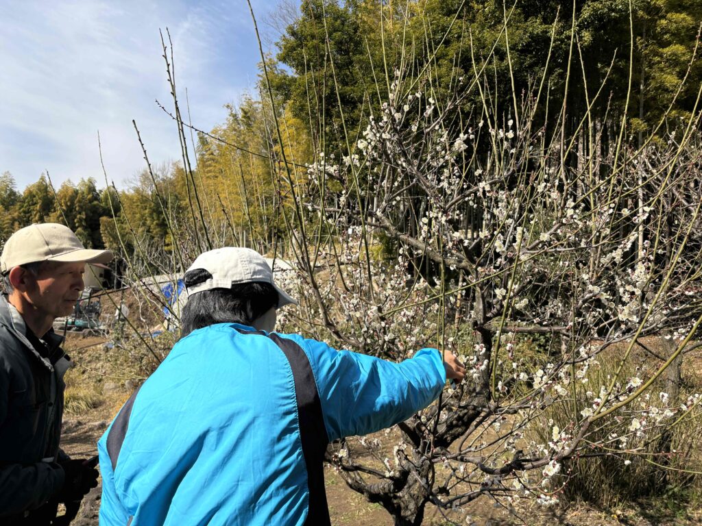 果樹園の梅の木を利用して、梅の整枝剪定講習会を行いました♪