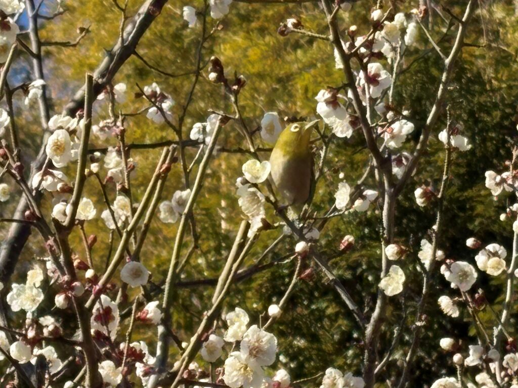園内の梅はそろそろ満開です♪ 可愛いメジロも花の蜜を吸いに来ていました!